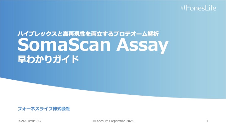 SomaScanTM Assayは、11,000種類のターゲットをCV5%以下という高い再現性で発現解析できるプロテオミクスプラットフォームです。今回はその特長をわかりやすく2つの資料にまとめました。