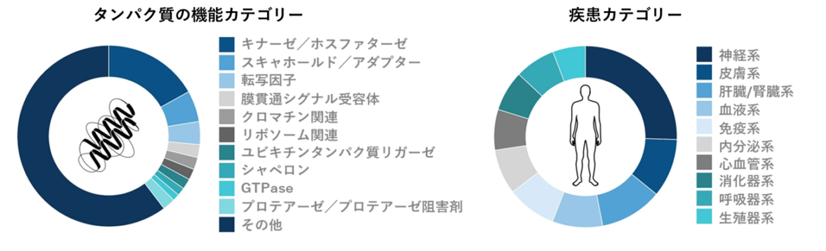 がん・自己免疫・神経疾患をはじめとする幅広い疾患領域をカバーし、1,800種以上のフルレングスタンパク質を用いた高精度な自己抗体プロファイリングを実現します。疾患関連タンパク質や免疫原性タンパク質を豊富に収録し、多様な機能クラスおよび疾患カテゴリーを網羅することで、研究や臨床応用における強力な基盤を提供します。