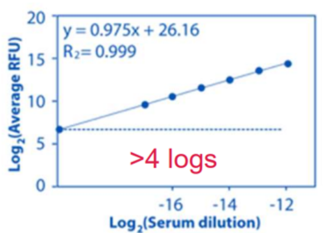 i-Ome® Protein Arrayでは、タンパク質の立体構造を保持することで、B細胞が認識する天然のエピトープを正確に提示します。これにより、抗体と抗原の結合効率が高まり、pMレベルの微量抗体でも高感度に検出でき、微量から高濃度まで広いダイナミックレンジで定量可能です。また、正しい構造の抗原のみが抗体と結合するため、バックグラウンドが抑制され、弱い信号も精度高く解析できます。