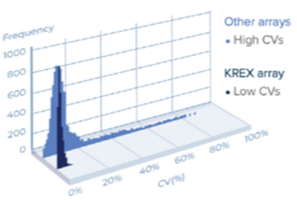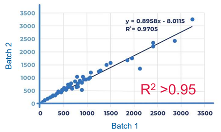 アレイ内での測定変動が平均CV10%未満と非常に低く、高い再現性を実現しています。さらに、バッチ間でも相関係数R²が0.95以上と安定しており、複数ロットにわたって信頼性の高い解析結果が得られます。