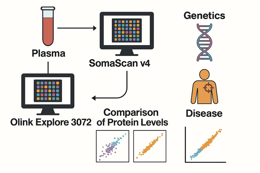 この研究では、2つの主要な高精度プロテオミクス技術「Olink Explore 3072」と「SomaScan® v4」を用いて、ヒト血漿中のタンパク質レベルと遺伝的変異との関連を大規模に解析し、疾患との関係を比較・検証しました。英国バイオバンク(UK Biobank)とアイスランドのコホートから得られた約9万人のデータを用いて、両プラットフォームの測定精度、再現性、遺伝的関連(pQTL)の検出能力を評価しました。